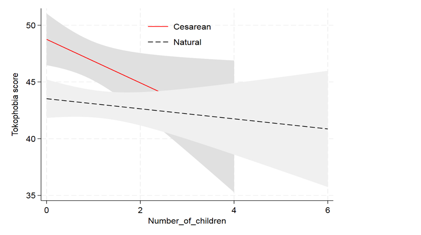 It can be observed from Figure 1 that the tokophobia scores tend to decrease with the addition of children for both delivery methods, indicating a moderating effect of parity. However, it is noteworthy that women with cesarean deliveries report, by far, higher tokophobia scores in comparison to women who have had natural births, without considering the level of parity. This difference is more pronounced among women with low parity, but does not persist as they have more children. The confidence intervals depicting the confidence level ranges indicate that the perceived discrepancies become more pronounced as the number of children increases, which emphasizes the enduring impact of the method of delivery on tokophobia (Figure 1).