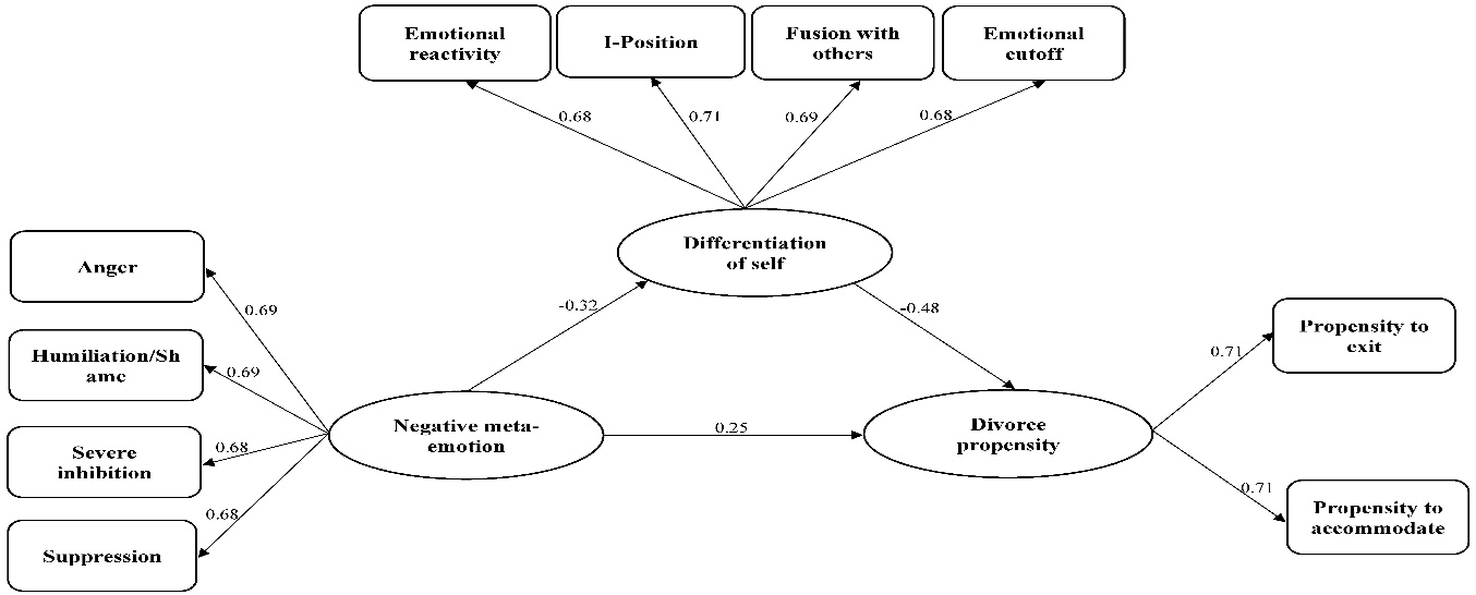 Table 3 details the direct and indirect pathways within the final structural model. All hypothesized direct effects were found to be statistically significant (P<0.001). Specifically, negative meta-emotion displayed a significant positive direct effect on divorce propensity (β=0.25), indicating that elevated levels of negative meta-emotion directly contribute to an increased psychological inclination towards marital dissolution. Negative meta-emotion also demonstrated a significant negative direct effect on differentiation of self (β=-0.32), suggesting that individuals experiencing more negative meta-emotion tend to exhibit lower levels of differentiation of self. Furthermore, differentiation of self exerted a significant negative direct effect on divorce propensity (β=-0.48), underscoring its pivotal role as a protective factor. Crucially, the indirect effect of negative meta-emotion on divorce propensity via differentiation of self was also statistically significant (β=0.15, P<0.001). This finding confirms that the differentiation of self partially mediates the relationship, implying that negative meta-emotions influence divorce propensity not only through a direct pathway but also by adversely impacting an individual's capacity for differentiation of self. The final structural equation model is depicted in Figure 1.